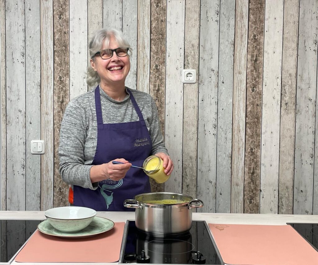 Stolz erzählt sie mir, dass sie seit Corona auch Online Kochen via Zoom anbietet: „Die Teilnehmer sehen meine Hände bei der Arbeit und über die zweite Kamera direkt in den Kochtopf. Sie können zuhause selbst mitmachen und die Rezepte direkt umsetzen.“